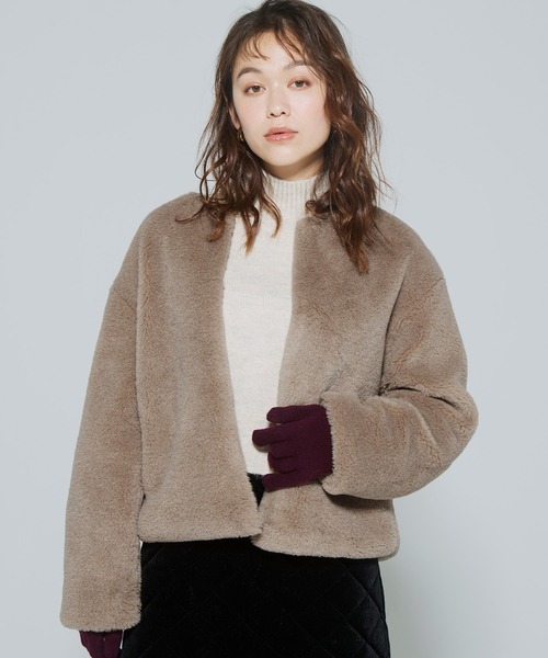 シンプルで上品なノーカラーデザインのフェイクファーブルゾン