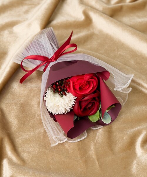 クリスマス限定カラーのソープフラワーブーケ華やかなレッドと深みのあるボルドーに、ホワイトのアクセントを添えたソープフラワーブーケ。
