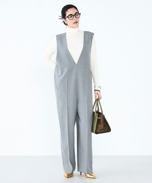 ・胸元を大きくVネックに開けた女性らしさのあるデザインのシンプルなサロペット