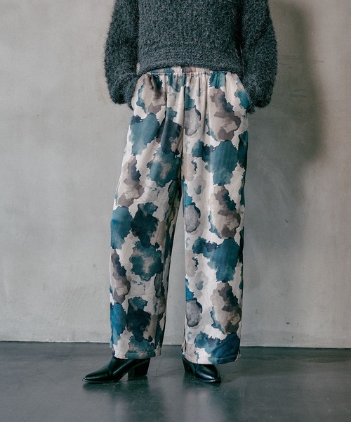LEPSIMで人気のストレッチサテンスカートの素材を使用し、柄をプリントしたパンツです。ウエストは総ゴム仕様で、内側に調節できる紐も付いています。大胆な柄が目を惹くので、スタイリングの主役級アイテムです!