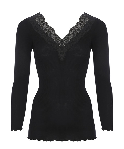 細めのリブとモダンな編みレースをふんだんに使用したレーシーなVネックタイプの9分袖インナーです。
