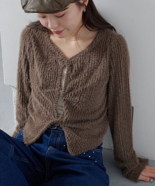 ふんわりとしたシャギー素材が季節感を高めるツイストデザインプルオーバー。