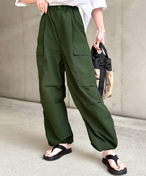 キーワード:カーゴパンツ レディース ウエストゴム ストレート ハイウエスト フルレングス ワイドパンツ 無地