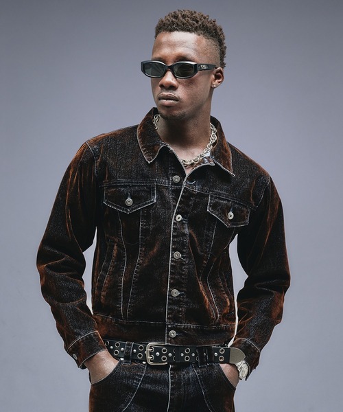 今年トレンドのフロッキー加工の上から特殊オーバーダイ加工を施したデニムセットアップが登場。