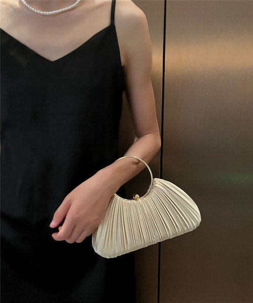 上品な光沢とプリーツデザインが目を惹くクラッチバッグ。丸型ハンドルがアクセントになり、持つだけでスタイリングを華やかに仕上げてくれます。普段使いはもちろん、パーティーシーンや特別な日の装いにもぴったりの存在感です。