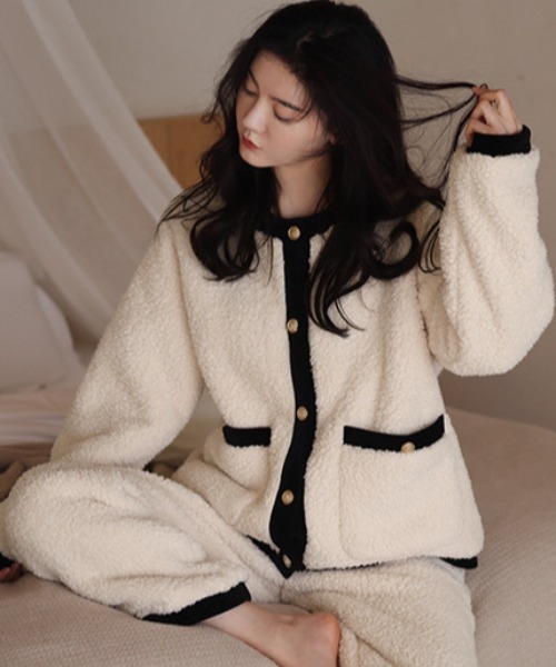 ふんわりと厚みのあるフリース素材を使用し、肌に触れた瞬間からぬくもりを感じられるセットアップ。保温性が高く、軽やかな着心地なので長時間着てもストレスが少なく、おうち時間を快適に過ごせます。寒い季節の防寒対策としても心強い一枚です。