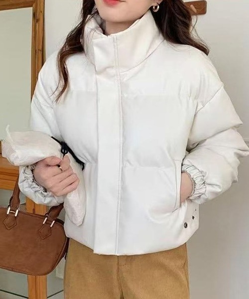 艶感のあるPU素材を使用した、スタンドカラーの中綿ショートジャケット。