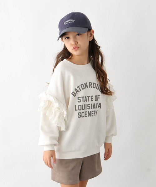 肩のフリルとカジュアルなロゴプリントが絶妙に融合した、フェミニンとカジュアルが調和したデザインのスウェットです。