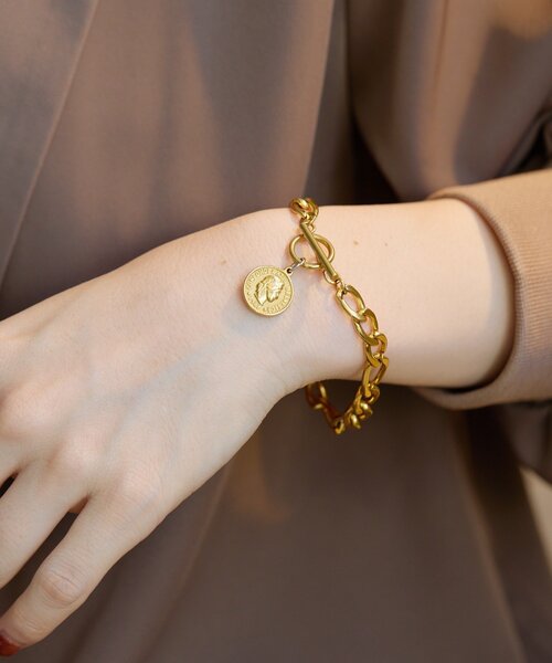 手元に高級感をプラスする【コイン付フィガロブレスレット】程よいボリュームのフィガロチェーンが、シンプルながらも存在感を放ちます。