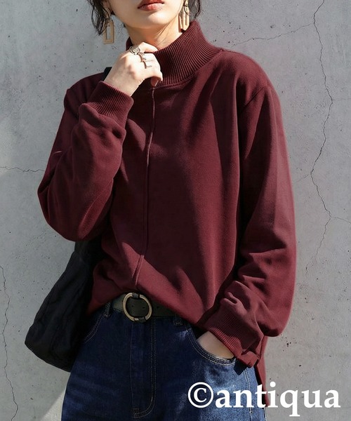 ネックラインはほどよい高さのモックネックで、リブ仕立てが首元にフィットしながらも締めつけ感はありません。