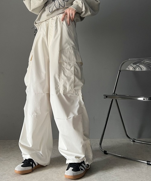 キーワード:カーゴパンツ レディース ウエストゴム ストレート ハイウエスト フルレングス ワイドパンツ 無地