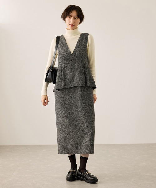 ・リブインナーなどのコンパクトなニットとのコーディネートはワンピース自体のすっきりとしたシルエットを活かせるのでイチオシ。