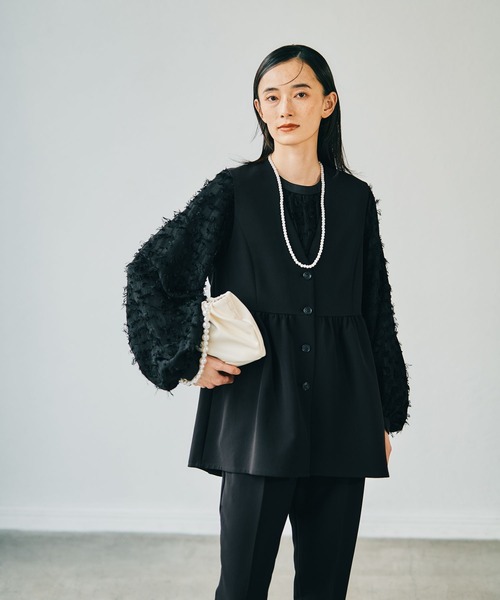 お尻回りや腰回りなど気になる部分をカバーできるオススメの切り替えベストです。ギャザーがたっぷり入ることでペプラムシルエットで着用することができます!手洗いでの洗濯が可能なのも嬉しいポイント!同素材のテーパードパンツなどとセットアップで着用するのがおすすめです◎