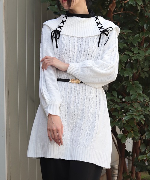 毎年大人気!レースアップがフェミニンな、オフタートルのニットチュニックです。