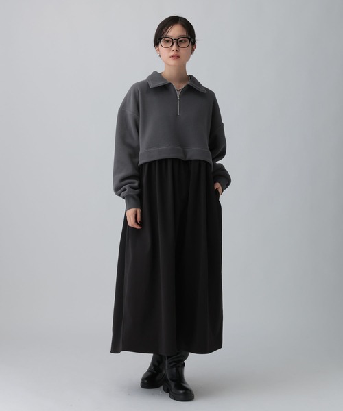 トップス部分はフリース素材で暖かく、ZIP開けて抜け感も出すことができます!スカート部分は透けにくい素材にし、ボリュームもあるので安心感のあるワンピースです。