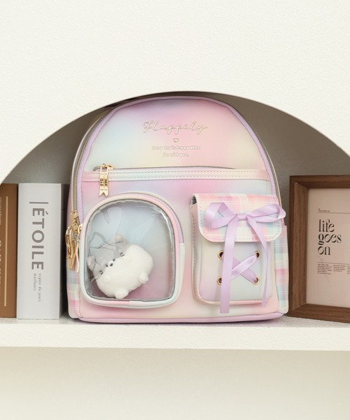パステルカラーのグラデーションとリボンポケットが可愛らしさを引き立て、クリアポケットから覗くぬいぐるみが遊び心をプラス。
