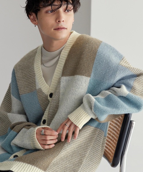 参考商品名:ランダムパッチワークデザイン モヘアライク ルーズVネックカーディガン