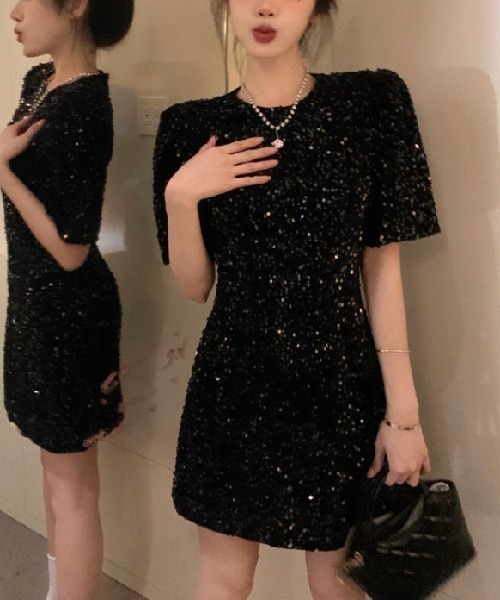 キラキラスパンコールの光沢が華やかな可愛いミニドレスです