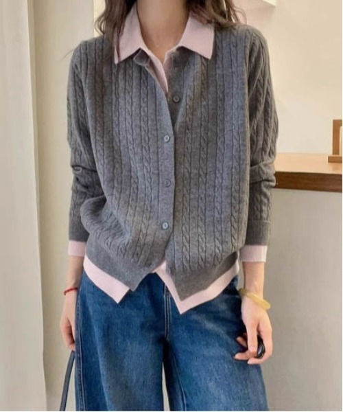 襟、袖口、裾にポロニットを合わせたようなディテールあしらい、