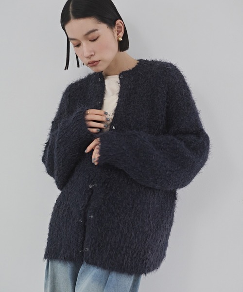 3種類の糸を使用した、片あぜ編みニットカーデ。ポコポコとした形が丸い糸が特徴的で、表情をプラスします。やわらかな肌触りで、ふんわりとした印象が女性らしく◎