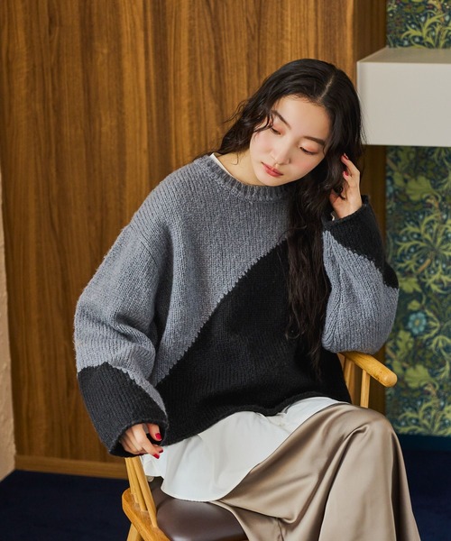 大胆なアシンメトリーのバイカラーデザインが目を引くニットプルオーバー。