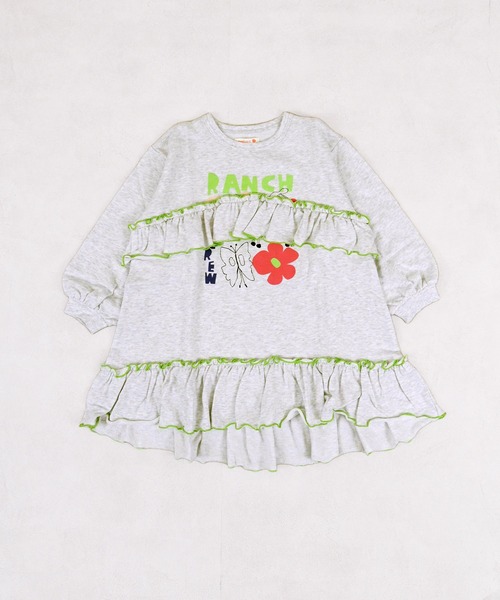 裾にもたっぷりフリルを重ね、動くたびにふわっと揺れる女の子らしいシルエットに仕上げています。