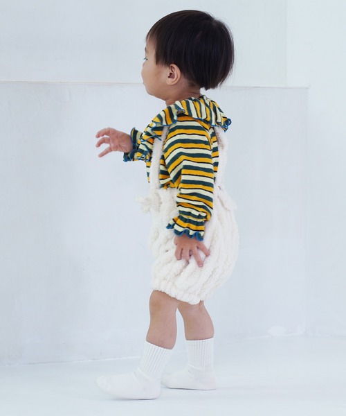 ロンパースやカットソーに合わせるだけで、冬らしいあたたかみのあるほっこりコーデが完成。