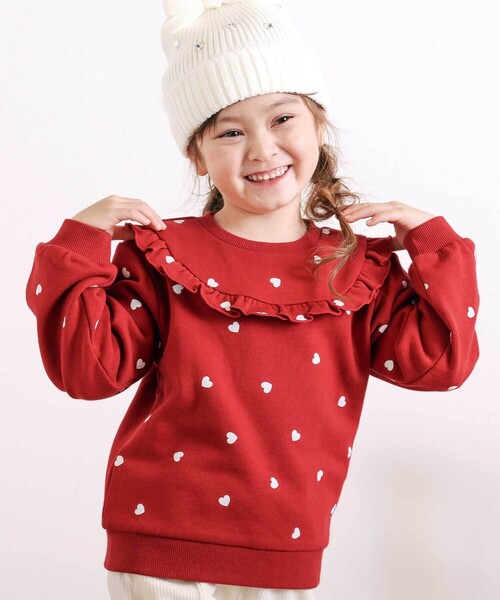 ハート柄とフリルの可愛らしいデザインで、毎日着たくなる一枚になっています。