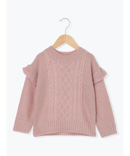 立体感のあるケーブル編みに、肩のフリルが可愛らしさを添えるニット。