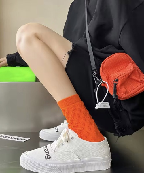 ぽこぽことしたデザインが足元のアクセントになるカラーソックス。