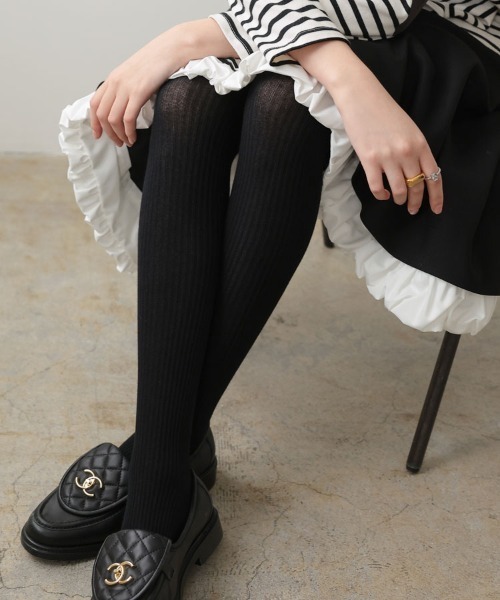 すっきりと縦ラインを描くリブ編みのカラータイツ。