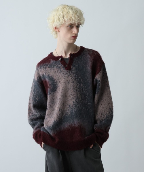 トレンド感のあるヘンリーネックとアーティスティックなグラデーション柄が目を惹くニット