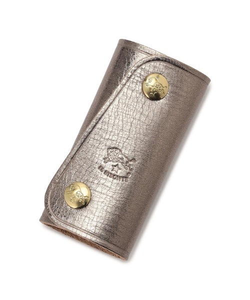 華やかなメタリックカラーのキーケース。フロントとスナップボタンにはブランドロゴの型押しがさりげなくスタイリッシュなデザイン。鍵をくるっと包むタイプのシンプルかつコンパクトなフォルムも魅力。デイリーに活躍するアイテムです。
