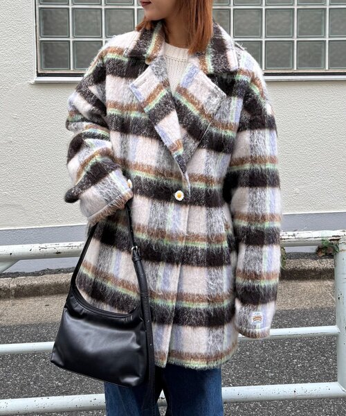 トレンドのシャギー素材を使用したチェック柄オーバーコート。