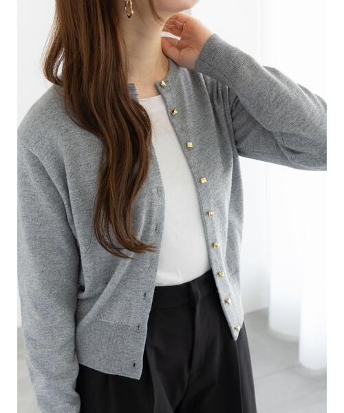 クラシカルなスクエア金釦がアクセントになっているクルーネックニットカーディガン。