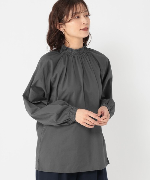 シャーリングを寄せてレースを重ね、伸縮性とボリュームを出した仕様のブラウス。
