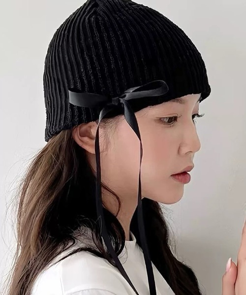 ・ベーシックなリブ編みニット帽に、片側のサテンリボンがアクセントになったアイテム。