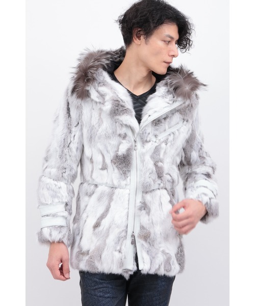 柔らかなラビットファーの静寂を、アシンメトリーなフロントジップが切り裂くように走る。インダストリアルな輝きを放つダブルファスナーポケット、手元をマニッシュに飾るダブル袖ベルト。そして、全体を引き締めるマットなシープナッパのライン。
