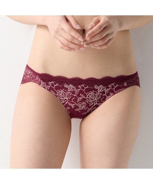 フロント脚口はややはハイレグで、はきこみの浅いヒップハンガータイプなので、浅めのボトムスとコーディネイトできます。