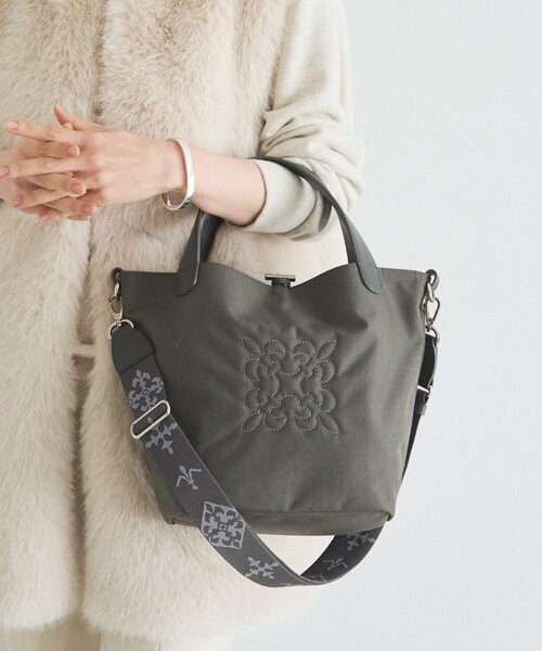 フロントのモノグラム刺繍が、上質なナイロン素材に立体感を添えています。