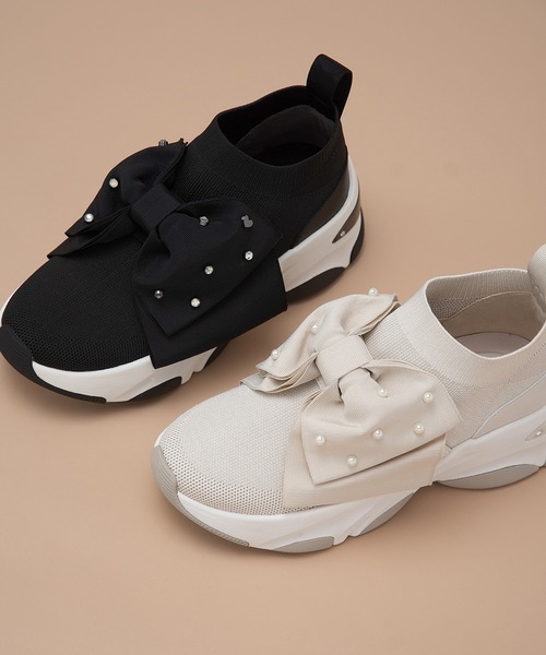 ■デザイン人気のソックススニーカーに、存在感たっぷりのビッグリボンを大胆にあしらったフェミニンモードな一足。