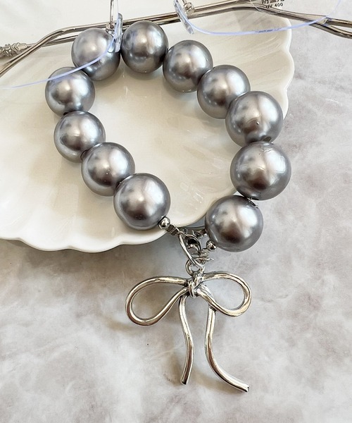 パール調ビーズ キーホルダー バッグチャーム リボンモチーフ シルバー ホワイト ブラック 韓国 韓国ファッション