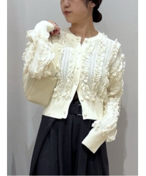 ドライタッチの糸で編み立てたニットにチュールフリルをドッキングさせた凹凸のある華やかなニットカーデ。