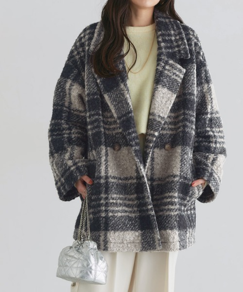 ふんわり起毛でこなれ見え。“ブークレーチェックピーコート”表面に凹凸感のあるブークレー素材を使用。柔らかく軽やかな着心地でしっかり暖かいのもポイントです。