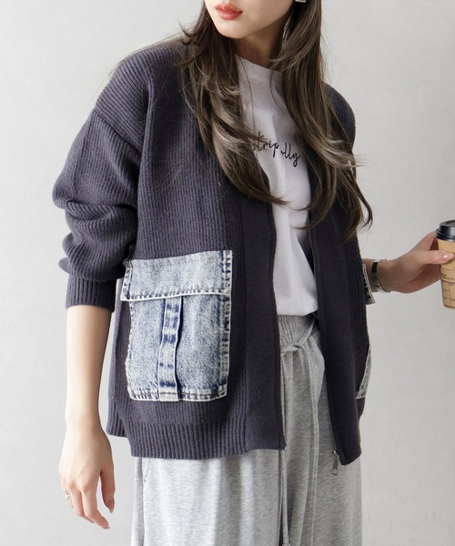 異素材のアクセントがトレンド感を高めるデニムポケット付きZIPカーディガン。