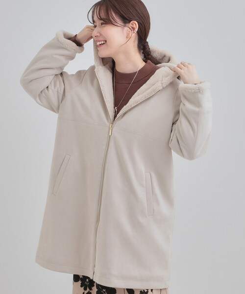 フード付きのデザインとムートン調の素材感がカジュアルにもきれいめにも合わせやすく、