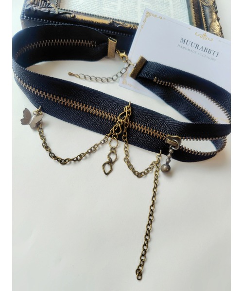 ゴールドのチェーンと十字架、十字架の棺がついたファスナーチョーカー。