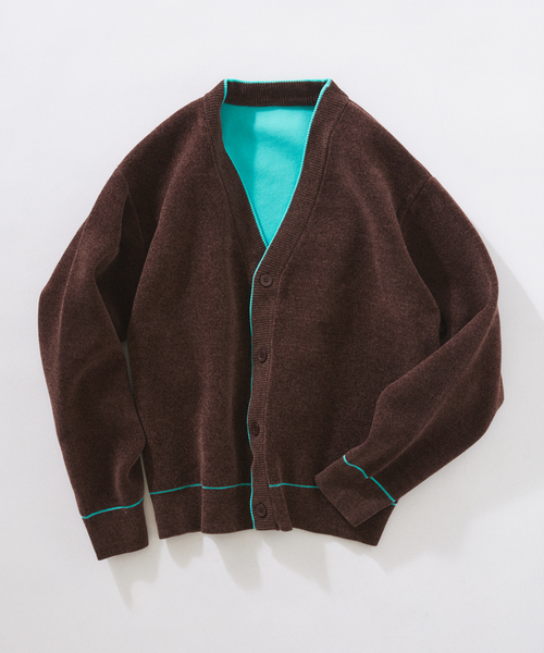 ポリエステルと細かく毛足の長いモール糸、ストレート糸を巧みに組み合わせたダブルフェイスで編み立てた、表情豊かなカーディガン。