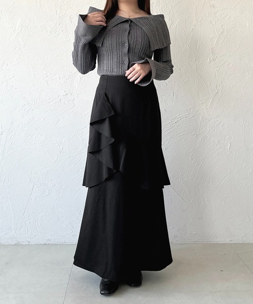 アシンメトリーなティアードフリルデザインが目を惹くマーメイドスカート。