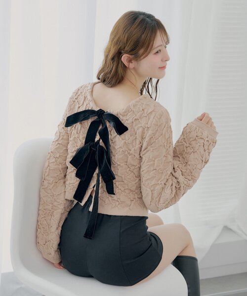 ・リボンを前にして後ろにしても着れる前後2way仕様で、カーディガンとしてもプルオーバーとしても着用可能です。